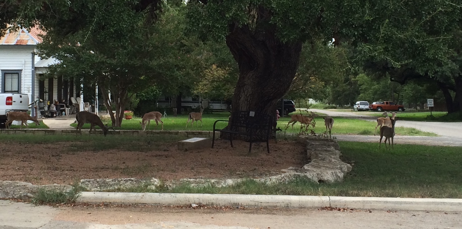 | We were sitting in the car, just outside of the library to access the wifi. DH said, "look over your shoulder, slowly." There was a herd of dear under an oak tree in the next yard. |